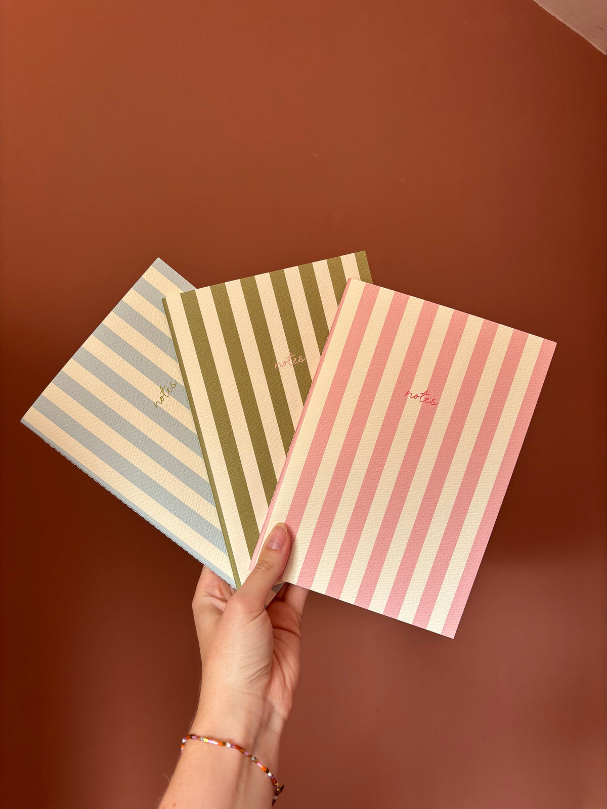 Wie houdt er niet van strepen? Deze fantastische notitieboekjes zijn voor echte stationary-lovers. Gebruik hem zelf om je gedachten of to do's op papier te zetten of geef hem cadeau! Verkrijgbaar in drie verschillende kleuren: roze, olijfgroen en blauw.